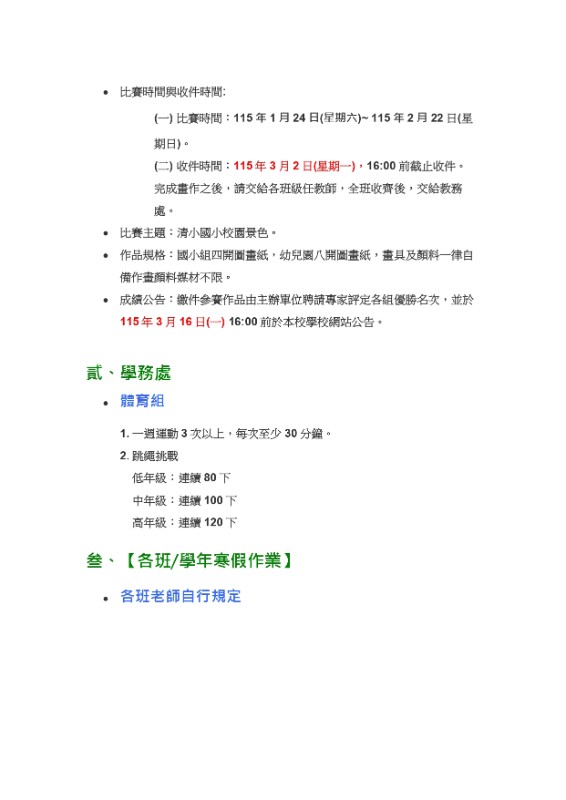 【寒假作業】114學年度清水國小寒假作業公告