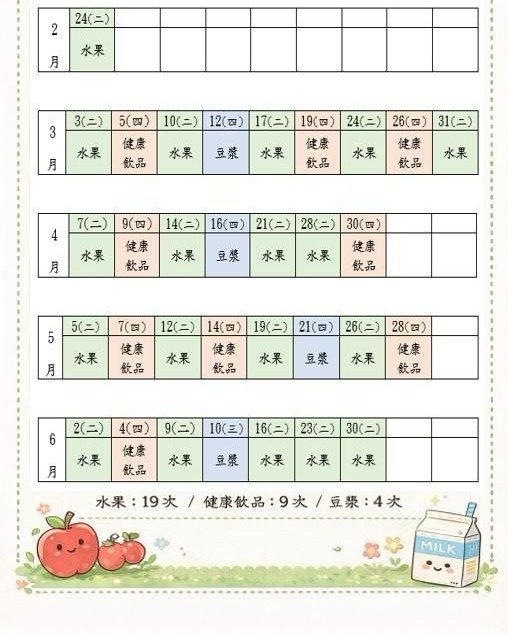 114下學期營養午餐水果/健康飲品/豆漿供應時間表。