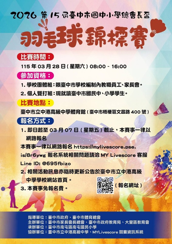 🏸2026第15屆臺中市國中小學總會長盃羽球錦標賽🥇 ✨時間:2026/3/28(六) 💖喜歡打羽毛球的校長.老師.家長委員會成員&國中.國小的孩子們~ 👉賽事資訊查詢系統: