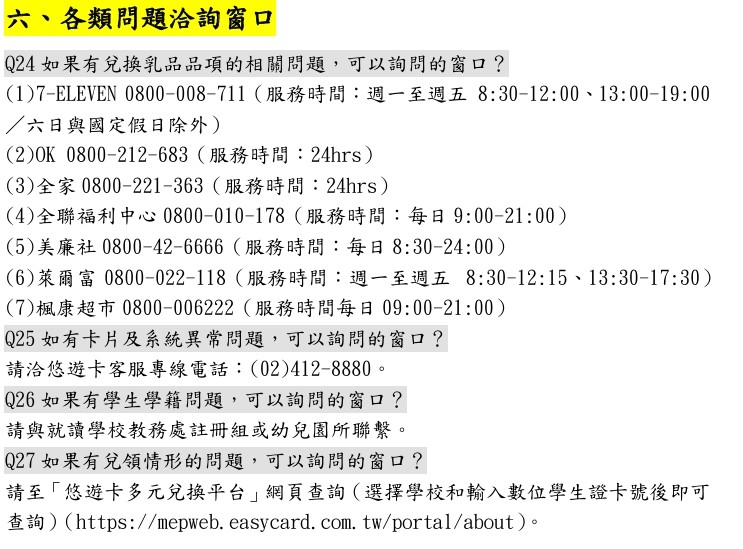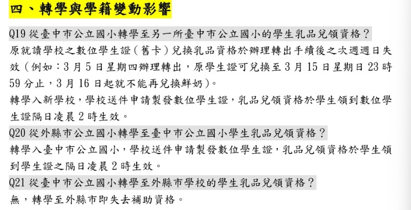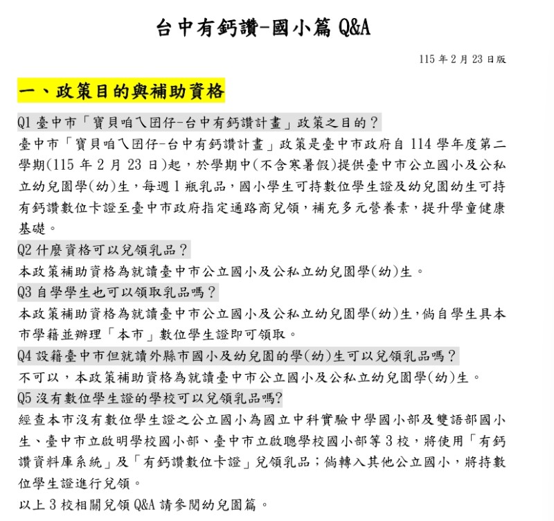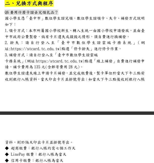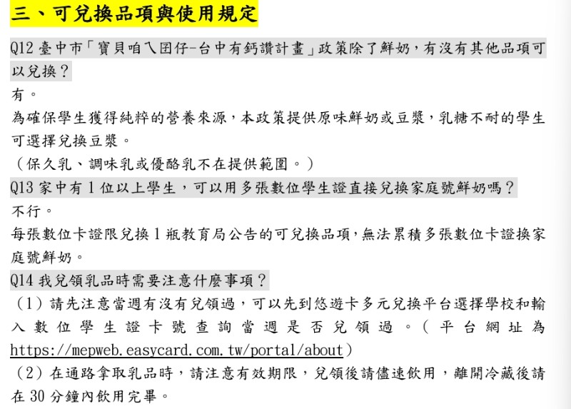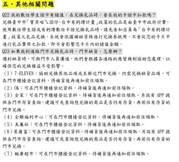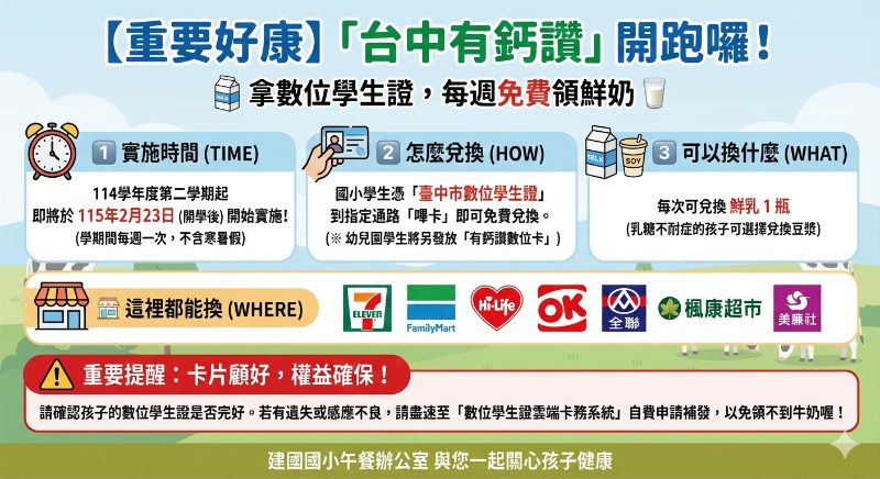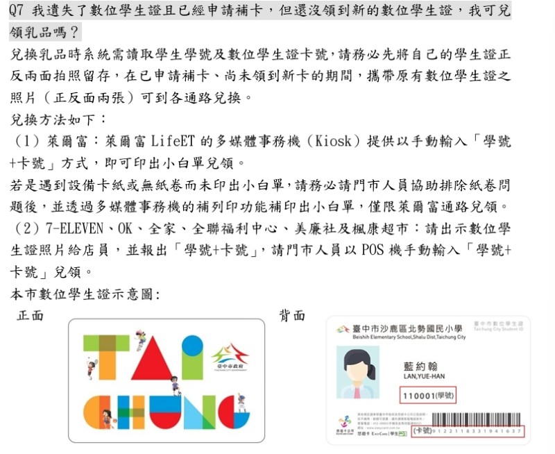 台中有鈣讚-國小篇Q&A 115 年2月23日版 一、政策目的與補助資格 Q1 臺中市「寶貝咱ㄟ囝仔-台中有鈣讚計畫」政策之目的? 臺中市「寶貝咱ㄟ囝仔-台中有鈣讚計畫」政策是臺中市政府自114學年度第二 學期(115 年 2 月23 日)起,於學期中(不含寒暑假)提供臺中市公立國小及公私 立幼兒園學(幼)生,每週1瓶乳品,國小學生可持數位學生證及幼兒園幼生可持 有鈣讚數位卡證至臺中市政府指定通路商兌領,補充多元營養素,提升學童健康 基礎。 Q2 什麼資格可以兌領乳品? 本政策補助資格為就讀臺中市公立國小及公私立幼兒園學(幼)生。 Q3 自學學生也可以領取乳品嗎? 本政策補助資格為就讀臺中市公立國小及公私立幼兒園學(幼)生,倘自學生具本 市學籍並辦理「本市」數位學生證即可領取。 Q4 設籍臺中市但就讀外縣市國小及幼兒園的學(幼)生可以兌領乳品嗎? 不可以,本政策補助資格為就讀臺中市公立國小及公私立幼兒園學(幼)生。 Q5 沒有數位學生證的學校可以兌領乳品嗎? 經查本市沒有數位學生證之公立國小為國立中科實驗中學國小部及雙語部國小 生、臺中市立啟明學校國小部、臺中市立啟聰學校國小部等3校,將使用「有鈣 讚資料庫系統」及「有鈣讚數位卡證」兌領乳品;倘轉入其他公立國小,將持數 位學生證進行兌領。 以上3校相關兌領Q&A請參閱幼兒園篇。 二、兌換方式與程序 Q6 要用什麼卡證去兌領乳品? 國小學生憑「臺中市」數位學生證兌領,數位學生證領卡、失卡、補發方式說明 如下: 1.領卡方式:本市所屬國小學校新生、轉入生統一由國小學校申請發放,並由臺 中市政府公費製發,倘有卡片遺失或損毀之情形,須自費進行換補發。 2. 掛失:請自行登入至「臺中市數位學生證雲端卡務系統」(網 址:https://stcard.tc.edu.tw)點選「停卡掛失」進行停卡作業。 3.補發方式:請自行登入至「臺中市數位學生證雲端 卡務系統」(網址https:/stcard.tc.edu.tw)點選「線上補發」自費進行補發申 請,補卡費用為135元(含郵寄費用28元)。 數位學生證遺失線上申請卡片補發,並完成繳費後,製卡單位於當天下午三點前 收到銀行入帳資料,當天印出卡片並掛號寄出;如當天下午三點後收到銀行入帳 資料,則於隔天印出卡片並掛號寄出。 ◆ 超商繳費:銀行入帳約需七個工作天 ◆ LinePay 繳費:銀行入帳為當天 ◆ 信用卡繳費:銀行入帳為當天 Q7 我遺失了數位學生證且已經申請補卡,但還沒領到新的數位學生證,我可兌 領乳品嗎? 兌換乳品時系統需讀取學生學號及數位學生證卡號,請務必先將自己的學生證正 反兩面拍照留存,在已申請補卡、尚未領到新卡的期間,攜帶原有數位學生證之 照片(正反面兩張)可到各通路兌換。 兌換方法如下: (1)萊爾富:萊爾富LifeET的多媒體事務機(Kiosk)提供以手動輸入「學號 +卡號」方式,即可印出小白單兌領。 若是遇到設備卡紙或無紙卷而未印出小白單,請務必請門市人員協助排除紙卷問 題後,並透過多媒體事務機的補列印功能補印出小白單,僅限萊爾富通路兌領。 (2)7-ELEVEN、OK、全家、全聯福利中心、美廉社及楓康超市:請出示數位學 生證照片給店員,並報出「學號+卡號」,請門市人員以POS機手動輸入「學號+ 卡號」兌領。 本市數位學生證示意圖: 正面 背面 Q8 我要去哪裡領取鮮奶?兌換方式是什麼? 國小學生可持「臺中市」數位學生證,幼兒園幼生(家長)及國立中科實驗中學 國小部及雙語部國小生、臺中市立啟明學校國小部、臺中市立啟聰學校國小部學 生持教育局配發的「有鈣讚數位卡證」,至指定通路商(7-ELEVEN、OK、全家、 全聯福利中心、美廉社、萊爾富、楓康超市)全國各縣市之門市,於通路商結帳 櫃檯主動告知兌換「台中有鈣讚」並靠卡兌換乳品,學期中每週可兌換1瓶。 詳細兌換流程將透過學校與教育局網站公告。 Q9 只能在臺中市的通路商門市兌換嗎? 不限於臺中市內,115年度可在本政策合作通路商的全臺門市兌換。 (7-ELEVEN、OK、全家、全聯福利中心、美廉社、萊爾富、楓康超市) Q10 我如果忘記兌換,上週的份額還能補領嗎? 不能補領。 本政策採每週兌換制,若未於當週(星期一0時00分起至星期日23時59分止) 兌換,則無法累積至下週,請務必記得在星期一至星期日之間領取當週的乳品。 (註:每週兌換係為學生均衡營養之實施。) Q11 靠卡有限制本人兌換嗎?可否由家長或親屬代為兌換? 沒有限制本人兌換,可由家長或親屬代為靠卡兌換,無須學生本人到場。 三、可兌換品項與使用規定 Q12 臺中市「寶貝咱ㄟ囝仔-台中有鈣讚計畫」政策除了鮮奶,有沒有其他品項可 以兌換? 有。 為確保學生獲得純粹的營養來源,本政策提供原味鮮奶或豆漿,乳糖不耐的學生 可選擇兌換豆漿。 (保久乳、調味乳或優酪乳不在提供範圍。) Q13 家中有1位以上學生,可以用多張數位學生證直接兌換家庭號鮮奶嗎? 不行。 每張數位卡證限兌換1瓶教育局公告的可兌換品項,無法累積多張數位卡證換家 庭號鮮奶。 Q14 我兌領乳品時需要注意什麼事項? (1)請先注意當週有沒有兌領過,可以先到悠遊卡多元兌換平台選擇學校和輸 入 數位學生證卡號查詢當週是否兌領過。(平台網址為 https://mepweb.easycard.com.tw/portal/about) (2)在通路拿取乳品時,請注意有效期限,兌領後請儘速飲用,離開冷藏後請 在30分鐘內飲用完畢。 Q15 可以補差價兌換其他品牌或容量的乳品嗎? 不可以。 臺中市「寶貝