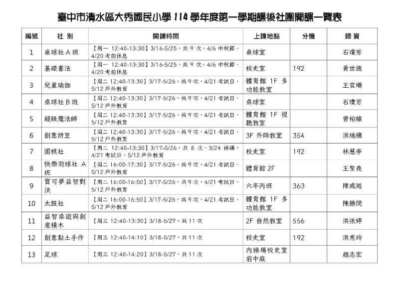 | 標題 | 臺中市清水區大秀國小114學年度第二學期課後社團開課公告(更新錄取名單) |