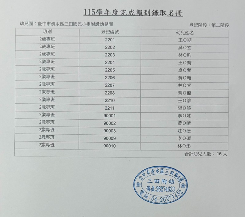 臺中市清水區三田國民小學附設幼兒園115學年度第二階段完成報到錄取名冊