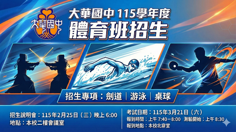 轉知:臺中市立大華國民中學115學年度體育班新生招生考試報名資訊