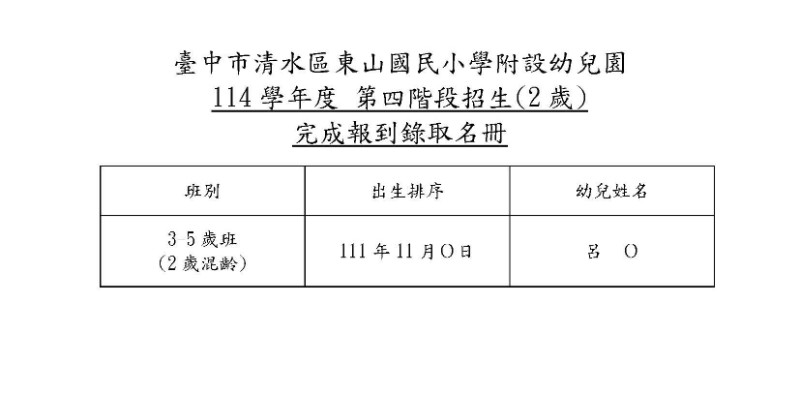 臺中市清水區東山國民小學附設幼兒園114學年度第四階段招生報到錄取名冊