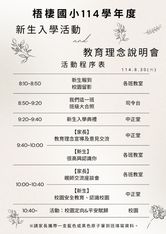 1.本校新生入學典禮通知單已在8/12(二)寄出,寄達地址為新生報到時所留的居住地。若8/19(二)後尚未收到,請撥打教務處電話04-26562834轉1710~1714。 2.本校新生入學典禮訂於8月30日(六)8:10-10:40舉行,相關活動程序請參閱新生入學典禮邀請函,歡迎您的蒞臨。 3.各班導師已於信件裡提供line的QR碼,請家長收到信件後儘快加入導師的line,有任何問題都可以透過line聯繫導師,謝謝。 4.另外,若有課後照顧服務的需求,請留意~本校報名方式採線上報名,報名時間為:114 年8 月22 日(五)上午8:00 ~8 月26 日(二)晚上23:59,報名詳細辦法請詳閱附件。