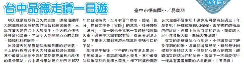 | 標題 | 賀!五年甲班易宸羽小朋友作品〈台中品德走讀一日遊〉榮獲《更生日報》刊登! |