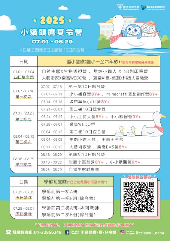 2025年夏令營日期為114/7/1-8/29,有四日雙主題營、十日綜合營及五日主題營 。報名方式至線上報名系統www.siileec.com。FB請搜尋:NCHUSMARTOWL;IG請搜尋:littleowl_nchu |