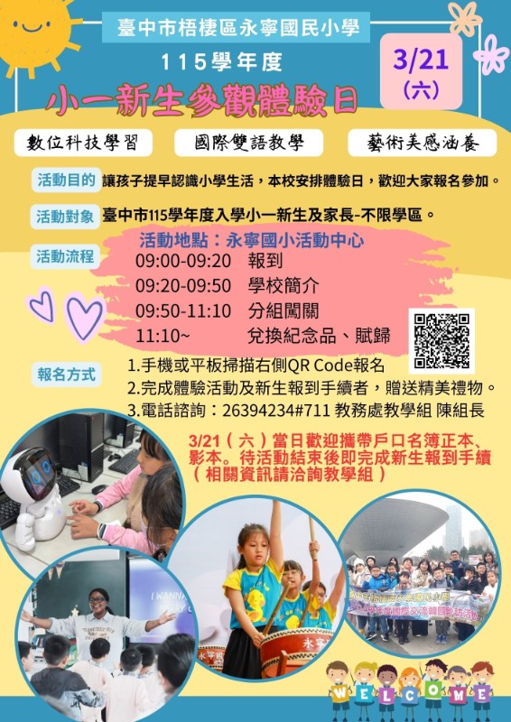 | 標題 | 本校於115年3月21日(六)辦理「115學年度小一新生體驗日」,歡迎新生家長及學生報名參加。 |