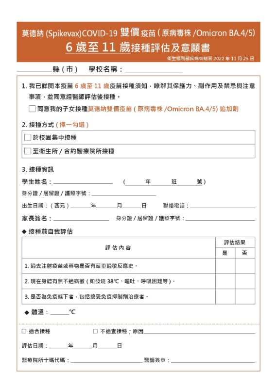| 標題 | 【莫德納 COVID-19雙價疫苗(原病毒株/Omicron BA.4/5)滿6歲至11歲兒童追加劑】校園集中接種意願調查 |