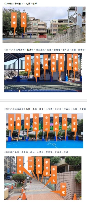(1)西校門旁榕樹下:文藻、佳嬅 (2)南邊半戶外球場 東側:蘿貝卡、陽光森林、成逸、愛讀書、愛力美、格蘭、熊學士 西側:高優、晶綵、佳音、小哈佛、全方位、何嘉仁、花旗、史賓塞 (3)東校門南側:李老師、林喆、大學仕、夢想家、布谷鳥、澄運 |