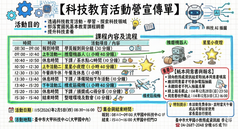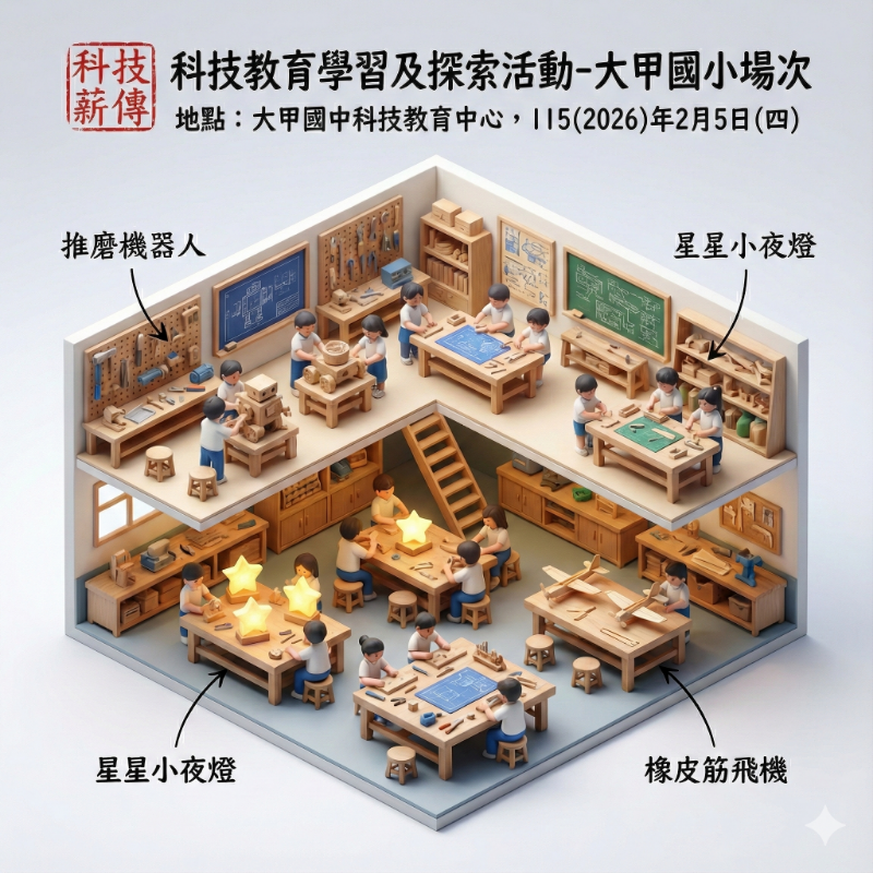 | 標題 | 【活動通知】臺中市國民中小學科技教育(含新興科技)學習及探索活動--大甲國小場次,請本校高年級學生及家長點閱內容。【線上報名已截止】【已完成線上報名者請盡速繳交家長同意書(收件至114年12月31日)。】【115/01/05(一)電腦抽籤後公告校網。】 |