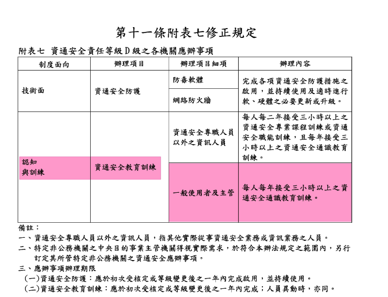四、 「資通安全責任等級為D級公務機關」請依據最新修正附表七規定,落實辦理資通安全教育訓練: