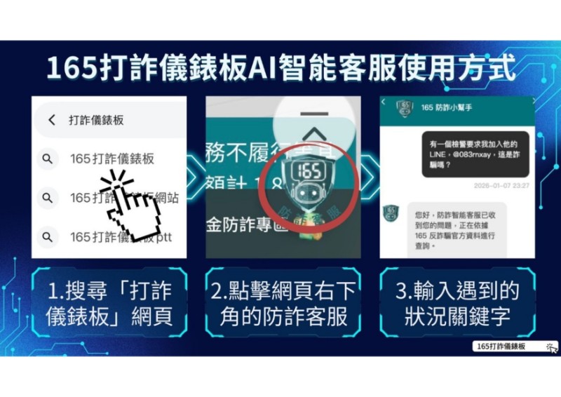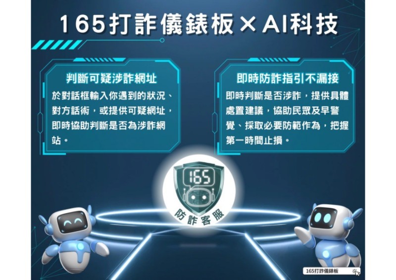 為因應詐騙手法快速演變,內政部警政署於「165打詐儀錶板」導入AI智能客服小幫手,整合防詐資料庫提供即時互動諮詢,可依民眾描述情境辨識詐騙風險並提供具體處置建議;另具備涉詐網址即時查詢功能,可判斷網站是否具詐騙風險。 |