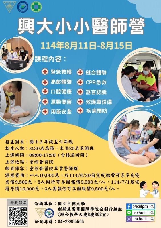 開班目的:鑒於醫療人員缺乏,醫療體系及醫護人員培育可向下扎根,特辦理興大小小醫師營,啟小朋友未來發展之可能性。招生對象:國小三年級至六年級對醫療及醫護學習有興趣者,不需任何基礎,均可報名參加。報名期間:即日起至額滿截止招收人數:30人,僅此一梯課程費用:學費10,000元,於114年6月30日前完成繳費可享早鳥優惠價9,500元,3人同行可享團報價9,500元/人,113/7/1起恢復原價10,000元,3人團報仍可享團報價9,500元/人。報名方式:1.採用通訊報名或網路預約報名。2.招生期間:即日起至額滿截止。3.報名網址: https://www.siileec.com/subject.php?sn=54124.洽詢電話:04-228555065.報名資料:身分證或健保卡影本、報名表及學費。附註:可至現場報名繳交現金或抬頭開立「國立中興大學」之郵政匯票。