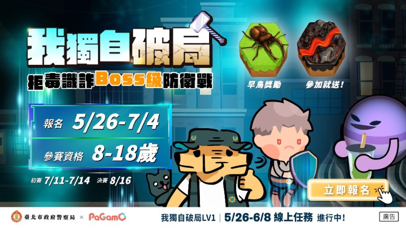 為強化兒少拒毒、識詐觀念,臺北市政府警察局辦理114年(下同)結合PaGamO遊戲化平臺推出「我獨自破局:拒毒識詐Boss級防衛戰」活動,透過遊戲化、情境式方式,促進其自主學習,強化法治觀念及自我保護知能,請學校鼓勵學生踴躍報名參加。 |