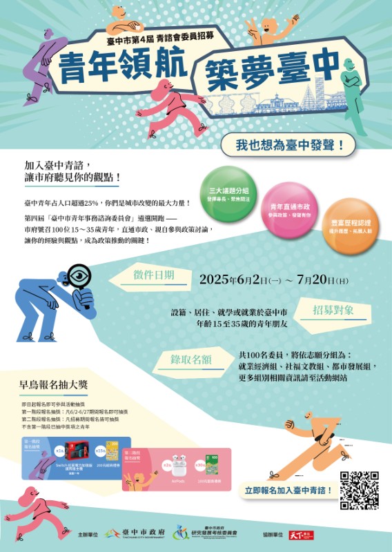 臺中市政府青年事務諮詢委員會第四屆青諮委員遴選簡章及電子海報 |