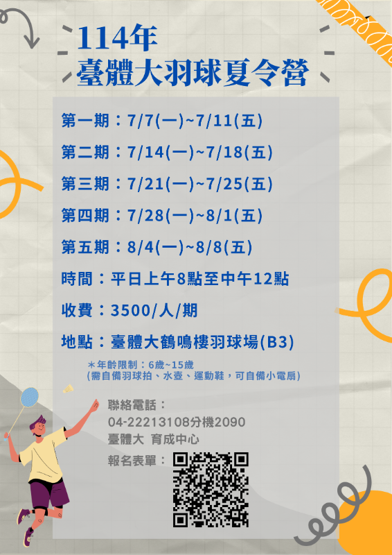 檢附營隊宣傳海報。如有任何疑問請洽臺體大育成中心,電話:04-22213108#2090,E-mail:ccbb12567@ntus.edu.tw。 |