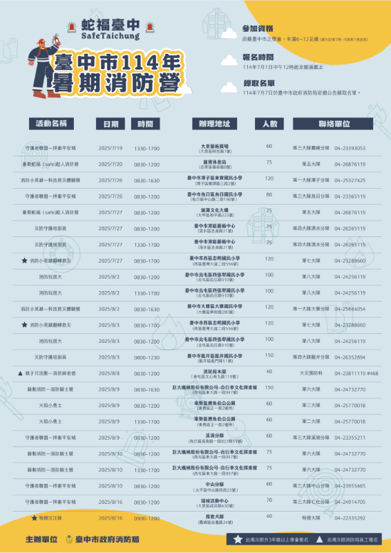 轉知「114年暑期消防營-蛇福臺中」防火教育推廣活動 |