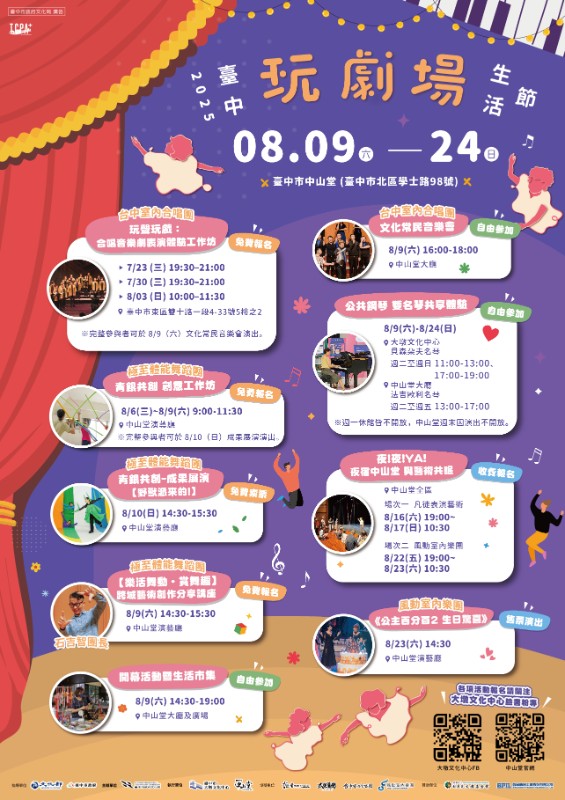 更多活動詳情可上大墩文化中心官網(https://www.dadun.culture.taichung.gov.tw/)及臺中市中山堂官網(https://hall.culture.taichung.gov.tw/HallFrontend/Home)查詢。