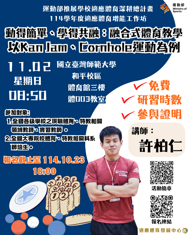 114學年度適應體育增能工作坊─動得簡單、學得共融:融合式體育教學,以Kan Jam、Cornhole運動為例 |