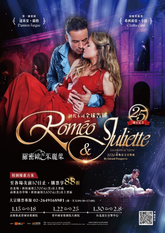 經典法文音樂劇《羅密歐與茱麗葉》自2001年在巴黎首演即轟動全球,以磅礴動人的音樂、現代感十足的編舞與都市巴洛克風格美學,重新詮釋莎士比亞經典悲劇,劇中更以紅與藍兩大色系象徵家族對峙,展現強烈視覺張力;而初代卡司的演出早已成為大眾心中難以取代的記憶,本次適逢音樂劇25周年同時也是初代卡司告別巡演,讓這次在台灣的演出更具紀念性。法文音樂劇以獨樹一格的「演唱會」形式製作打造,特別強調「音樂」與「演員魅力」,以「歌」帶「戲」是法式音樂劇製作的順序與模式,藉由歌曲詠唱以及雋永詞彙的表達,再加上多樣化背景音樂襯托,讓演員的情緒起伏及情感傳遞更加深刻。誠摯推薦師生前來觀賞國際級精彩演出,並藉此增進對各類表演類型的了解。 |