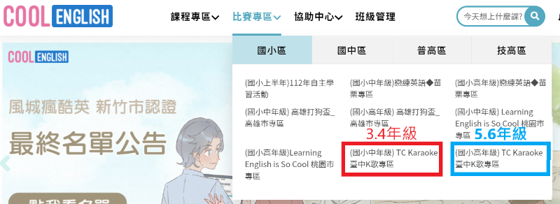 【酷英文認證】台中市教育局再度加碼「Cool English台中K歌」認證活動,歡迎3-6年級學生踴躍參加,自即日起到12/31截止。 一、參加對象:3-6年級學生。 三至六年級學生個人進入 Cool English 網頁後,依序點選「比賽專區」,就可以看到「TC SpeakOut 臺中K歌認證專區」,要依照自己的年級選擇『中年級』或『高年級』。完成報名程序,就能開始作答與認證。透過一邊聽好聽的歌曲,一邊完成歌詞的選填,可以加強聽力及閱讀能力,更希望大家可以把這些好聽的歌曲學會怎麼唱。 以下是中年級,高年級的15首歌,不要做錯年級了。 四、認證活動通過標準: 國小中年級(三、四年級)或國小高年級(五、六年級)需於認證區完成 15首歌曲歌詞選填,且平均分數達85分以上,即通過認證。 五、比賽網址:https://www.coolenglish.edu.tw/index.php 備註: 詳細圖文操作步驟請見CoolEnglish粉絲專頁:https://www.facebook.com/coolenglish.tw/