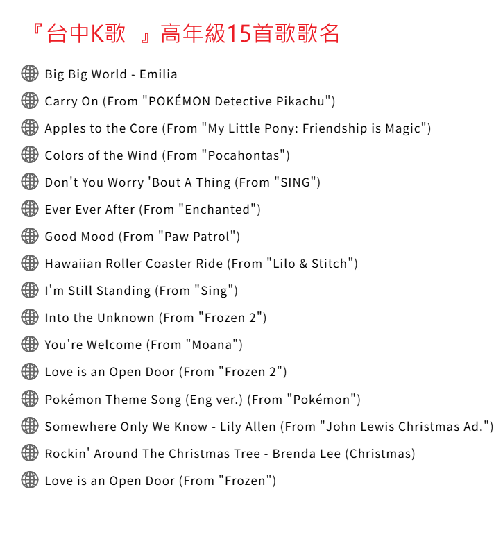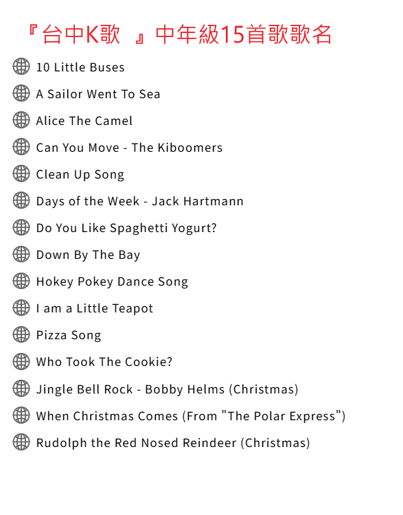 | 標題 | 【酷英文認證】台中市教育局再度加碼-「Cool English台中K歌」認證活動,完成15首歌歌詞,且平均得分達85分,即可得到禮券100元。歡迎3-6年級學生踴躍參加,自即日起到12/31截止。 |