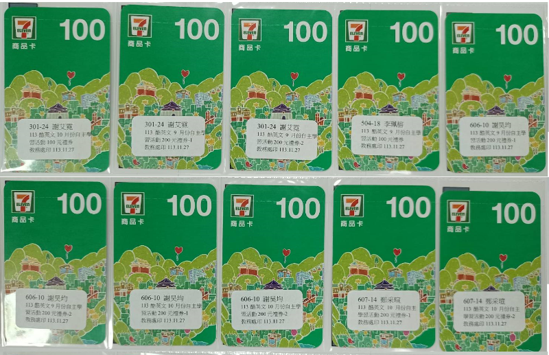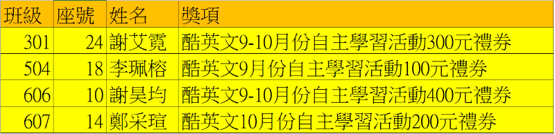 | 標題 | 【酷英文比賽】賀!!恭喜本校301謝艾霓、504李珮榕、606謝昊均、607鄭采瑄四位學生參加教育部酷英文網站『9、10月份自主學習』獲獎,獲得教育局加碼的7-11禮券,特此公告。 |