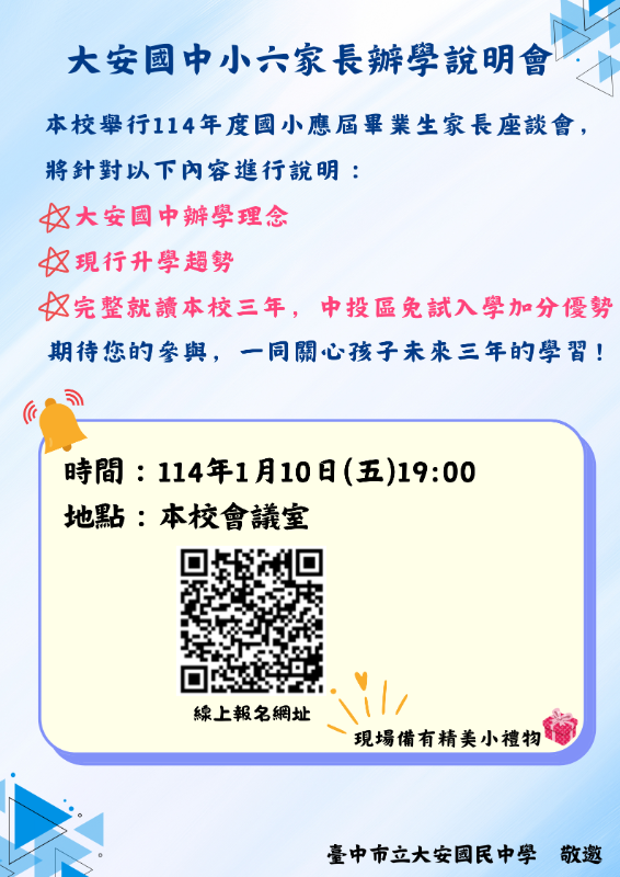 臺中市立大安國中114學年度「風韻國樂社招生暨辦學家長說明會」,詳見訊息內容。歡迎六年級學生、家長踴躍參加。
