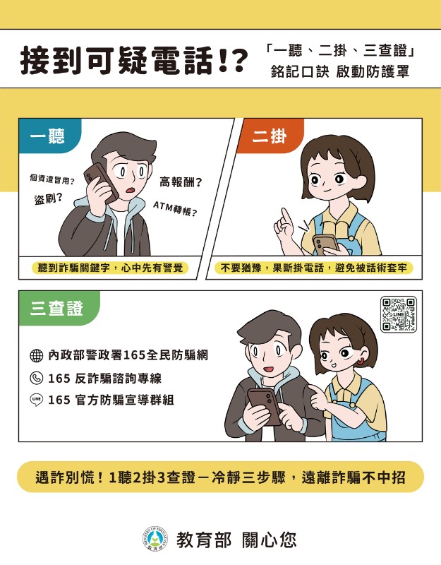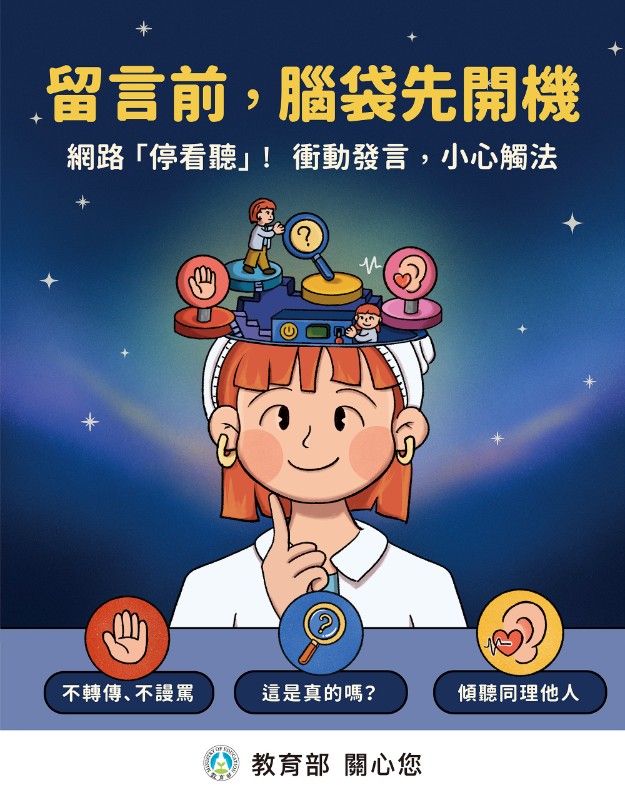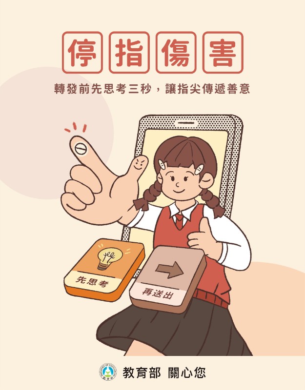主旨: 有關教育部製作「四防齊心、校園安心」相關宣導文宣,請透過多元管道加強宣導,請查照。 說明: 一、依據教育部國民及學前教育署114年10月23日臺教國署學字第1140105845A號函辦理(如附件)。