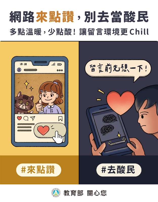 四、請學校推廣運用,利用多元管道宣導上開素材,建議如下: (一)影片:透過學校官網、粉專、LCD電子看版、臉書及IG等管道推播,或於導師時間、新生訓練、班級幹部研習時間播放。 (二)圖卡:透過學校官網、粉專、Line、臉書、IG等管道推播,並可下載製成適合於校園活動向師長宣導之樣式。