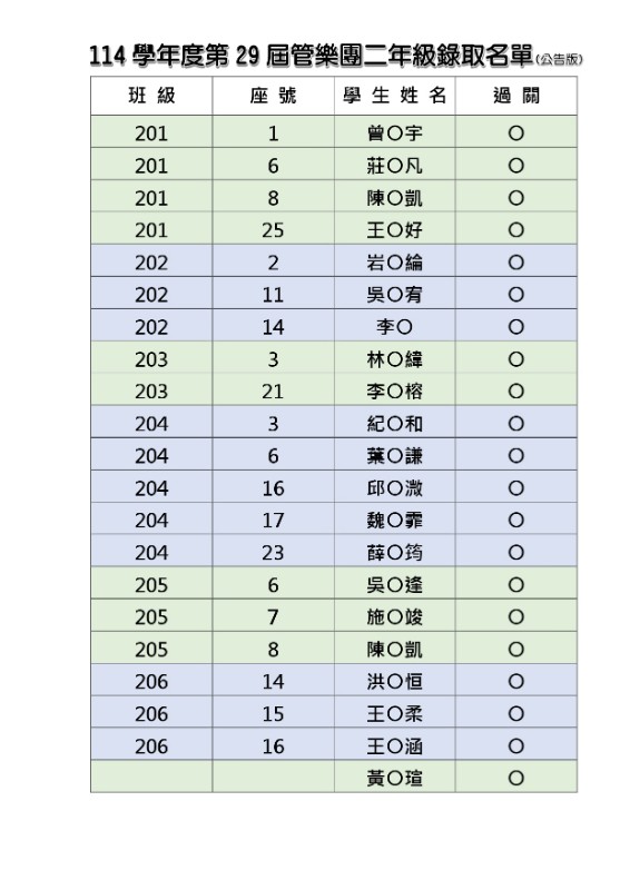 以下是本次管樂團二年級錄取名單,學校將於今日發下錄取通知單,