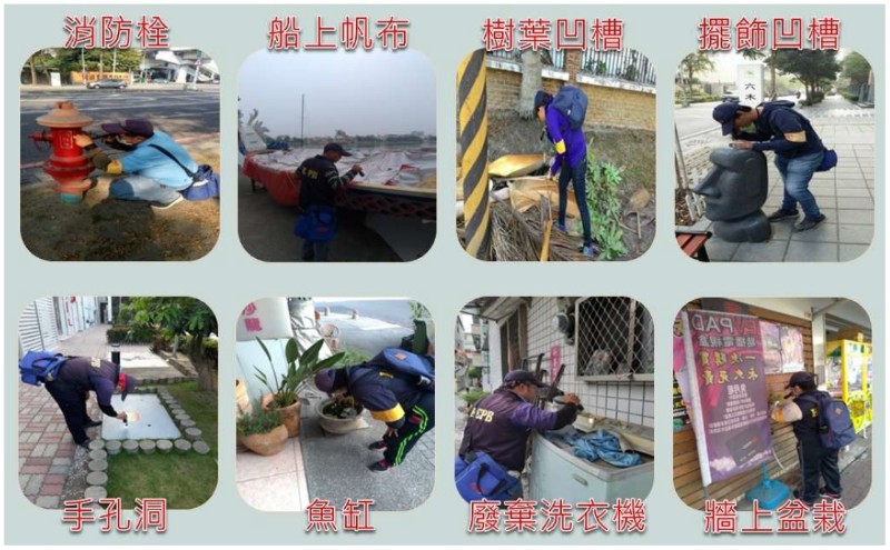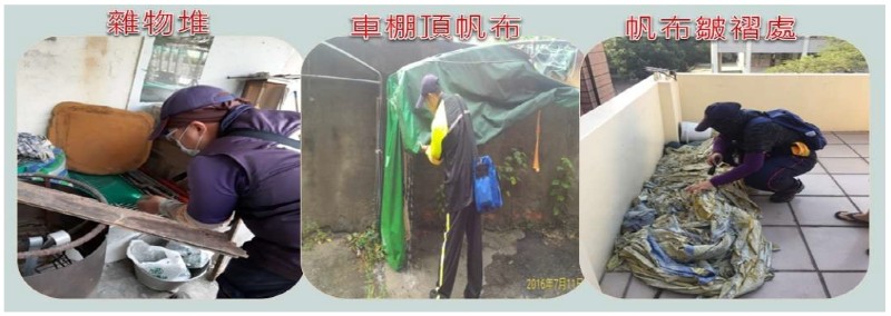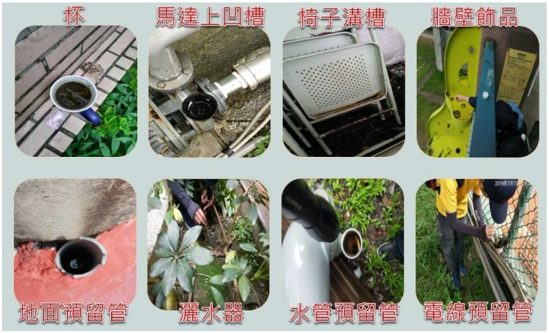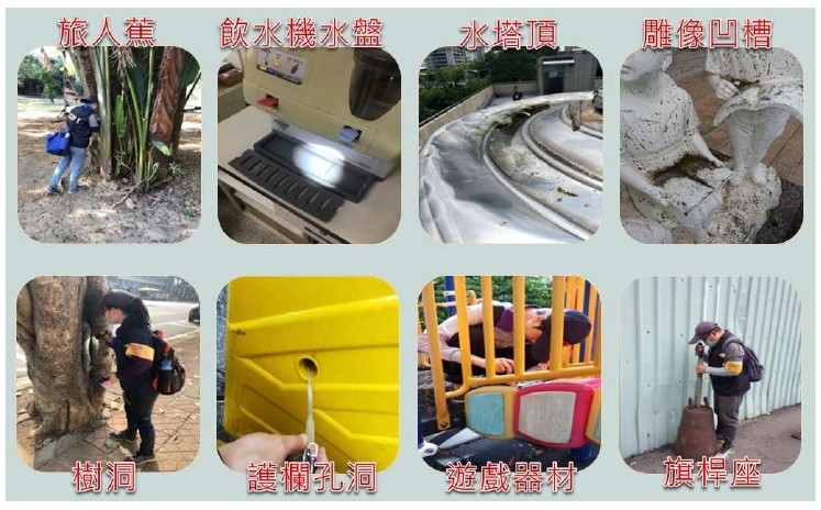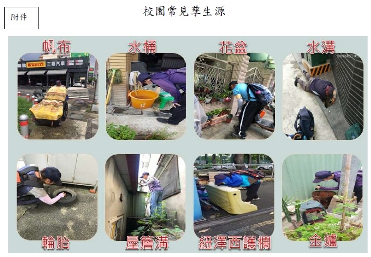 校園環境管理:清除積水為防治登革熱最有效的方法,請校內各責任區負責或巡檢人員務必每週定期巡檢至少1次,執行「巡」、「倒」、「清」、「刷」,尤其是容易積水的物品與地方(詳如附件校園常見孳生源),並加強容器之管理及減量等工作,使用中的儲水容器需加蓋或設置細網,不用時務請倒置或清除,以避免孳生蚊蟲。 |