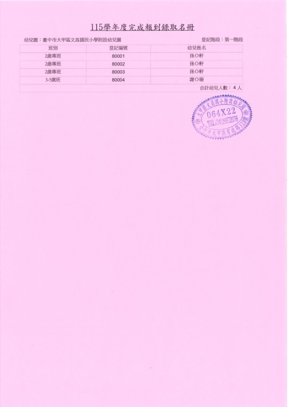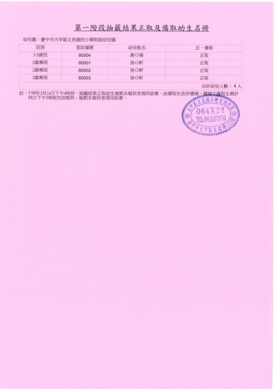 文昌附幼115學年度第一階段招生抽籤名冊與報到名冊