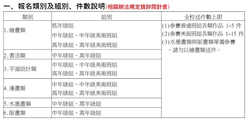 114學年度全國學生美術比賽臺中市初賽_校內評選結果 一、依據114學年度全國學生美術比賽臺中市初賽簡章辦理。 二、比賽共分6大類,19組別,相關訊息如下: