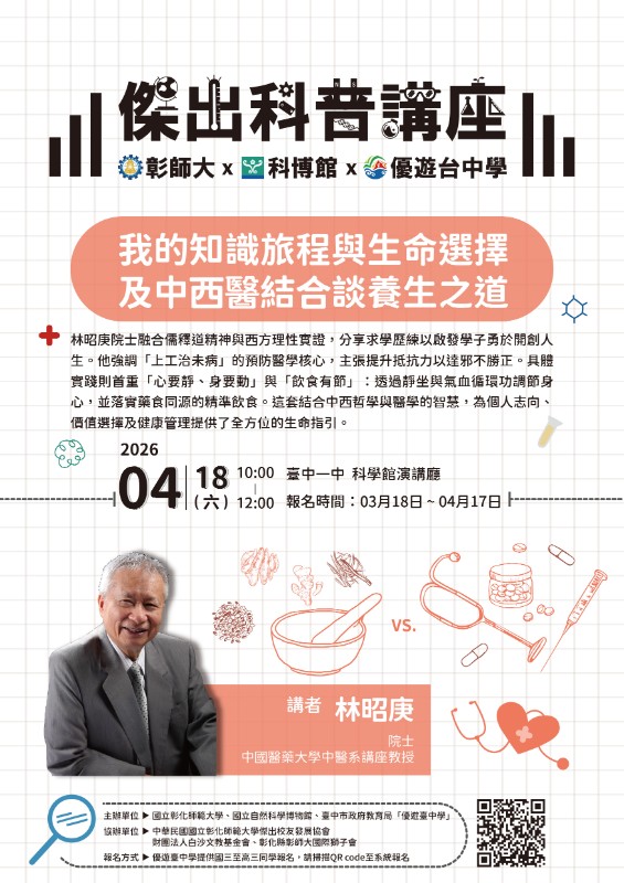 本局114學年度與國立彰化師範大學、國立自然科學博物館合作,共同辦理12場傑出科普講座。為擴大學習資源之運用,推廣科普教育,歡迎本市教師、民眾共同參與。