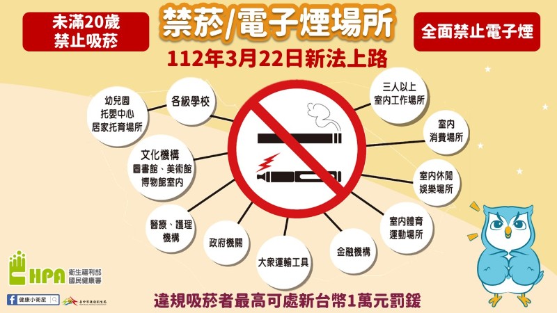 三、菸害防制法新法上路「未滿20歲不得吸菸,未查驗身分供應菸品予未滿20歲者,最高罰25萬元。」臺中市政府衛生局提醒您。 四、菸害防制法修法七大重點影片