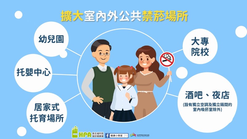 二、菸害防制法新法上路「擴大禁菸場所,大專院校、幼兒園、托嬰中心、居家式托育服務場所,室內外全面禁止吸菸,免費戒菸專線0800636363。」臺中市政府衛生局提醒您。