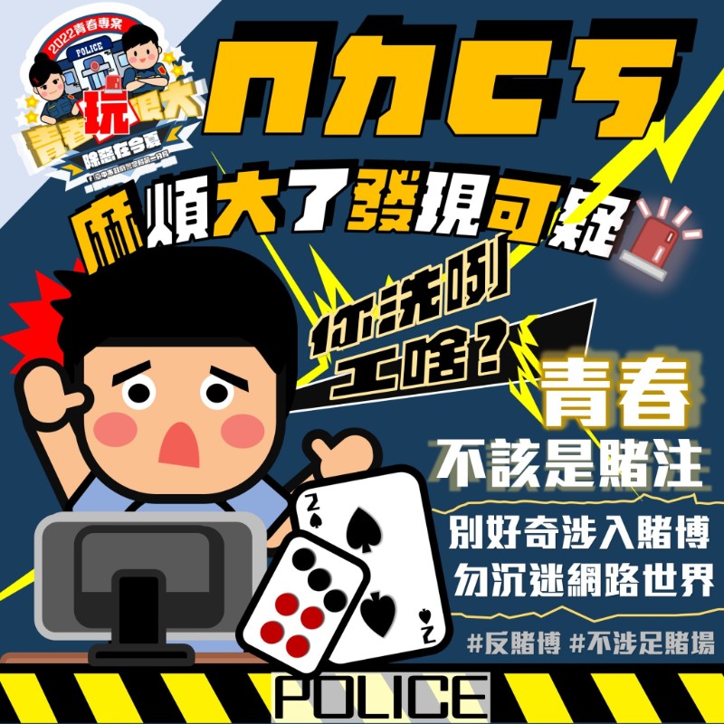 引用臺中市政府警察局第一分局2022年之宣導 本年度青春專案宣導五大主軸之一,防制少年涉足「德州撲克」等賭場或網路參與賭博,目的要保護青少年朋友,金錢觀念尚未建立良好的基礎,加上博弈本身就有機會成本的風險,在少年仍在求學階段尚無經濟基礎下,最容易遭受犯罪集團利用引誘犯罪,而遭受控制導致行為偏差。 警一分局張啓祥分局長表示:為保護青少年在暑假期間人身安全,防止不法之徒威脅利誘而誤入歧途,致生觸法或遭受傷害,提醒家長們朋友多多要關懷子女在外交友狀況及手機使用情形,並留意小朋友們是否無端擁有來路不明的奢侈品,或重度追求物質生活之情形,應多多與孩子們溝通互動,增進親情交流,撥空妥善安排其正當休閒活動。另提醒青少年朋友們網路賭博不是單純金錢遊戲,有好奇心但更要有警覺心,切勿被慫恿下單賭博衍生金錢糾紛,或遭犯罪集團利誘作為打工藉口,從事不法勾當。警方暑假維安不缺席,除惡除暴在今夏,必讓學子們度過平安順心的炎夏。 |
