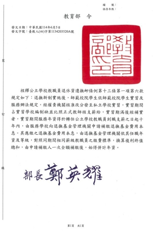 一、依據教育部114年6月5日臺教人(四)字第1134203520B號函辦理。 二、「公立學校教職員退休資遣撫卹條例」第13條第1項第6款規定解釋令。 核釋公立學校教職員退休資遣撫卹條例第十三條第一項第六款規定如下:退撫新制實施後,師範校院學生依師範校院學生實習及服務辦法規定,經權責機關核准改分發至私立學校實習,實習期間占實習學校編制缺並比照正式教師核支薪給,實習期滿後經補實者,實習期間服務年資得於轉任公立學校教職員到職支薪之日起十年內,由服務學校向退撫基金管理機關申請補繳退撫基金費用本息。其應繳之退撫基金費用本息,由退撫基金管理機關依其任職年資及等級,對照同期間相同薪級教職員之繳費標準,換算複利終值總和,由申請補繳人一次全額補繳後,始得併計年資。