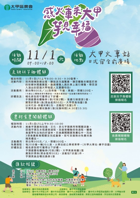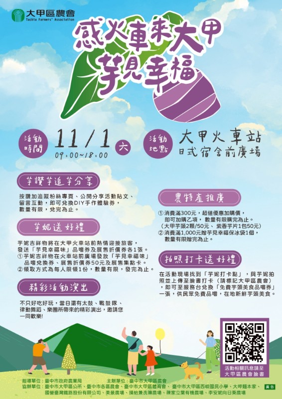 推廣大甲區優質芋頭及在地農特產品,本活動結合匠師故鄉特色、食農教育體驗與推廣行銷宣傳,藉此提升農產品牌價值、拓展市場通路,並加深民眾對在地農業文化的認識。