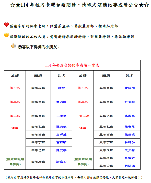 114年校內臺灣台語朗讀、情境式演說比賽成績公告