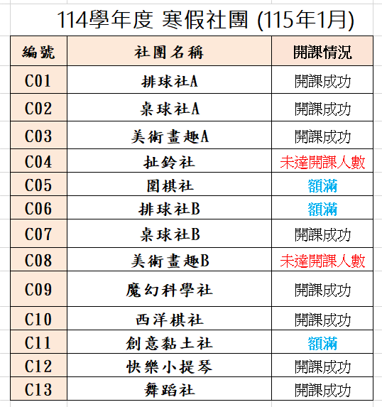 ★公告 竹林國小寒假社團 招生結果 未達開課人數:扯鈴社、美術畫趣B 未開設成功的社團,需退、換社團的學生,請於12/19(五)中午12:00前盡速與訓育組聯繫。