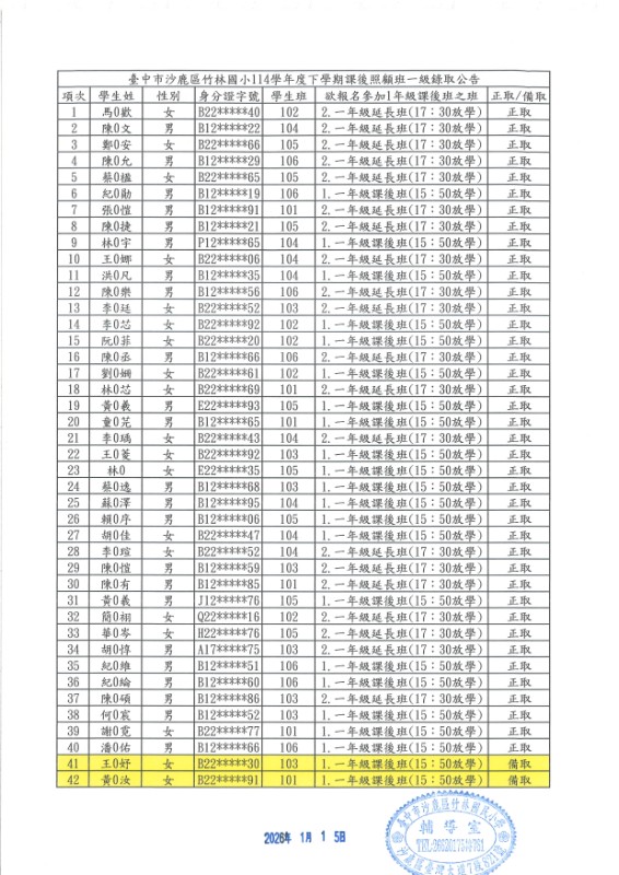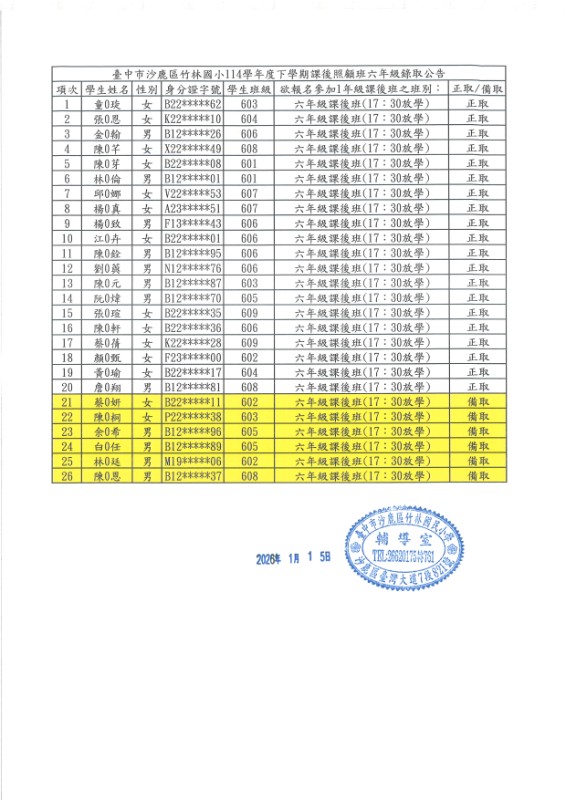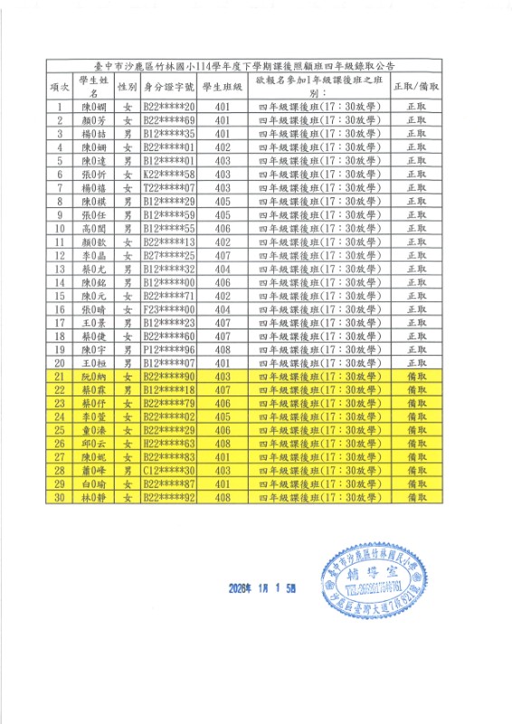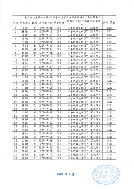 | 標題 | 臺中市沙鹿區竹林國小114學年度第二學期課後照顧班率取公告 |