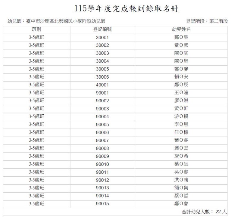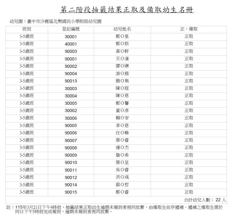 | 標題 | 臺中市沙鹿區北勢國民小學附設幼兒園115學年第2階段招生錄取與報到結果 |