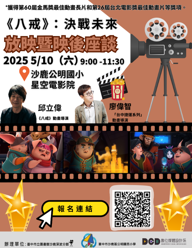 映後座談 🎬講師: 邱立偉 導演(金獎導演)、廖偉智 導演影片: ⧔ 八戒⧕(榮獲第60屆金馬獎最佳動畫長片)時間:114年5月10日(星期六)早上9:00~11:30地點:公明國小星空電影院活動對象:歡迎公明國小親子共同參與參加人數:200人, 4/23(三)早上9:00開放報名,額滿截止🔗 報名連結:https://reurl.cc/2KYr8a