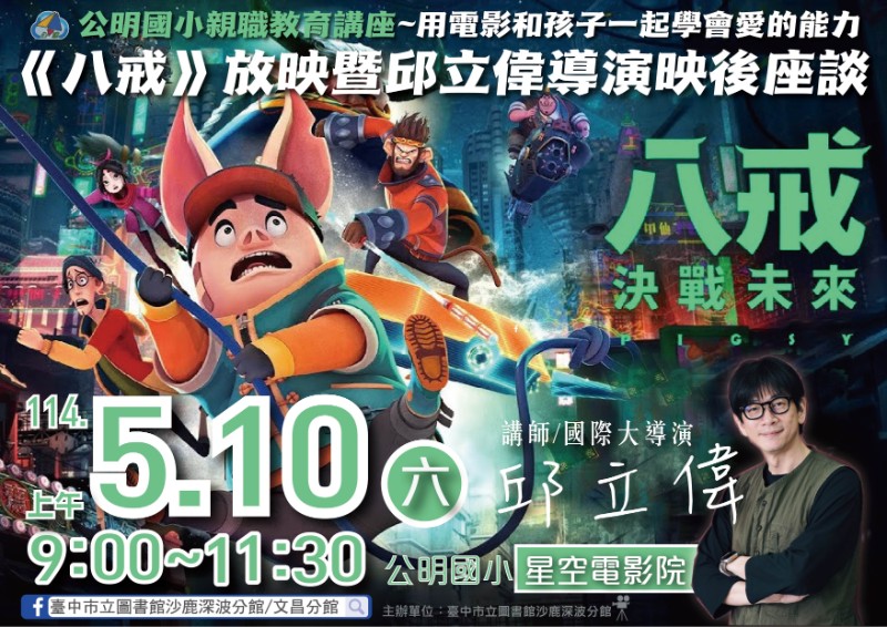 公明國小假日電影院暨教育優先區親職教育講座🔥本學期假日電影院暨親職活動來囉~💥這次,我們特地與沙鹿深波圖書館合作邀請邱立偉導演藉由電影”八戒”帶來最有啟發的情感眉角、最到位的成長經驗分享歡迎親子一起看電影紓壓!💁♂️💁不只是享受電影時光也藉由映後座談會打開與孩子對話的管道,了解孩子大腦情緒運作模式,透過電影角色和故事劇情增進親子互動、思考彼此生命課題,除了能了解孩子的想法,也能夠拉近親子之間的距離。誠摯邀請您的參與!