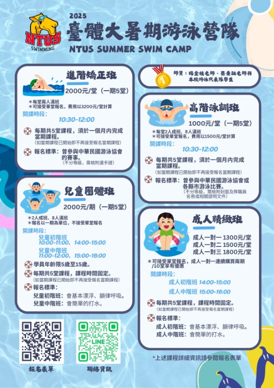 一、開課日期:114年7月7日(一)至8月29日(五)。 二、上課時間:不同課程詳細上課時間如附件。 三、報名連結:https://forms.gle/Wi8d2oKt1Z3g91Hx5 四、活動費用: (1)兒童團體班:2000元/期(一期5堂)。 (2)成人精緻班收費:一對一1300元/人/堂 (一期5堂);一對二 1500元/人/堂 (一期5堂);一對三 1800元/人/堂 (一期5堂)。 (3)高階泳訓班:1000元/堂(一期5堂)。 (4)進階矯正班:2000元/堂(一期5堂)。 五、備註:部分課程須具備相關標準,請參考附件海報。 六、如有任何疑問請洽本校育成中心葉小姐,電話:04-22213108#2090,E-mail:ccbb12567@ntus.edu.tw。