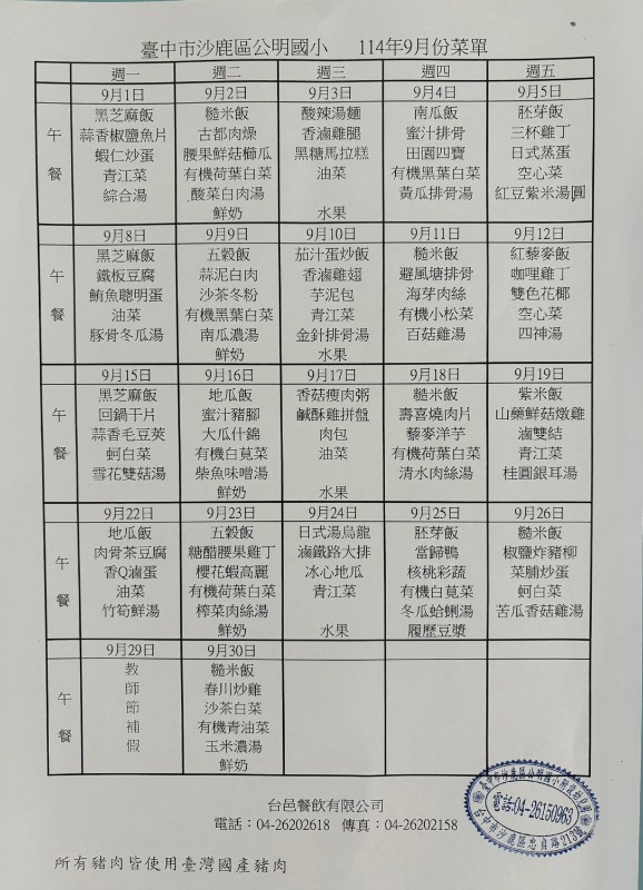 114年9月份餐點表
