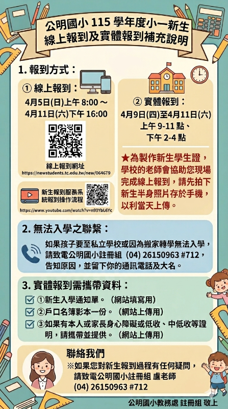 公明國小115學年度小一新生線上報到及實體報到補充說明 1.報到方式: ①線上報到:https://newstudents.tc.edu.tw/new/064679。 4月5日(日)上午8:00 ~ 4月11日(六)下午16:00。 *新生報到服務系統報到操作流程 https://www.youtube.com/watch?v=n9f3mYbl6Yc ②實體報到: 4月9日(四)至4月11日(六),上午9-11點、 下午2-4點。為製作新生學生證,學校的老師會協助您現場完成線上報到,請先拍下新生半身照片存於手機,以利當天上傳。 2.如果孩子要去私立學校或因為搬家轉學,無法入學,請致電公明國小註冊組(04) 26150963 #712,告訴我們原因,並留下你的通訊電話及大名。